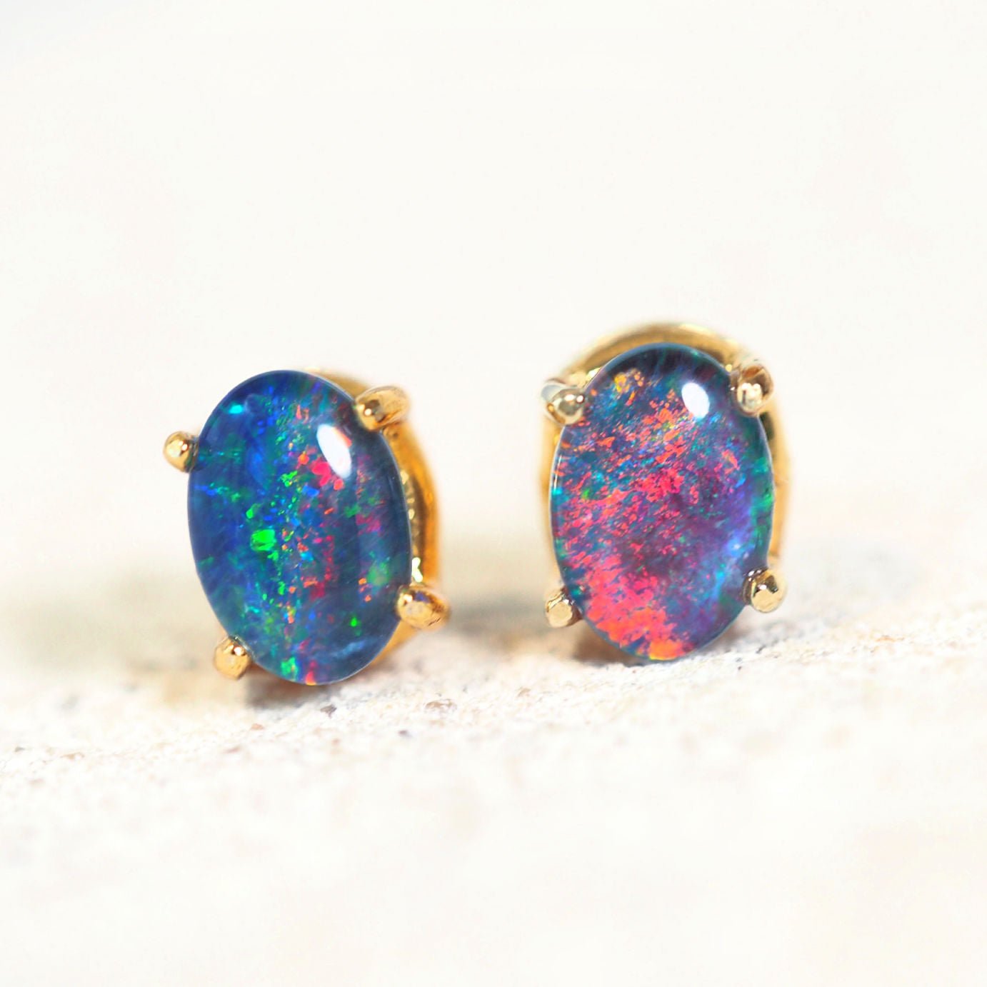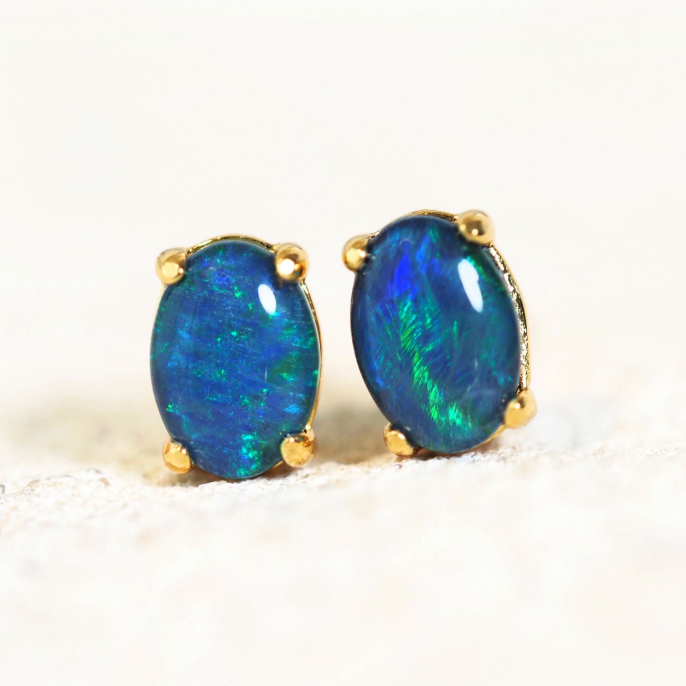 Gia は、鮮やかなオーバルシェイプのオーストラリア産トリプレットオパールをあしらった、美しいゴールドメッキのスターリングシルバー製スタッドピアスです。毎日の装いにエレガントな雰囲気を添えます。ドレスアップにもカジュアルにもぴったりなこのピアスは、魅惑的な色彩の輝きを放ち、一つ一つが唯一無二の特別な一品です。