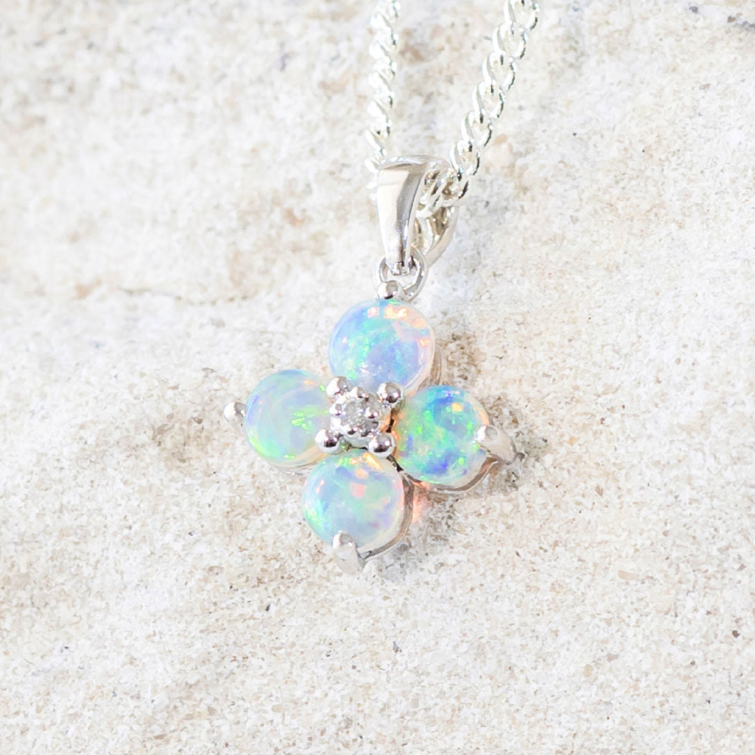 9カラットのホワイトゴールドに繊細な花模様をあしらったこの美しいペンダントは、南オーストラリア産の美しいブルーとグリーンのラウンドカットのソリッドクリスタルオパール4個を爪留めしています。鮮やかなホワイトダイヤモンドがさりげない輝きを添え、いつまでも愛用していただけるタイムレスな逸品です。重ねづけにも、単体でも活躍します。シルバーメッキのチェーンが付属します。