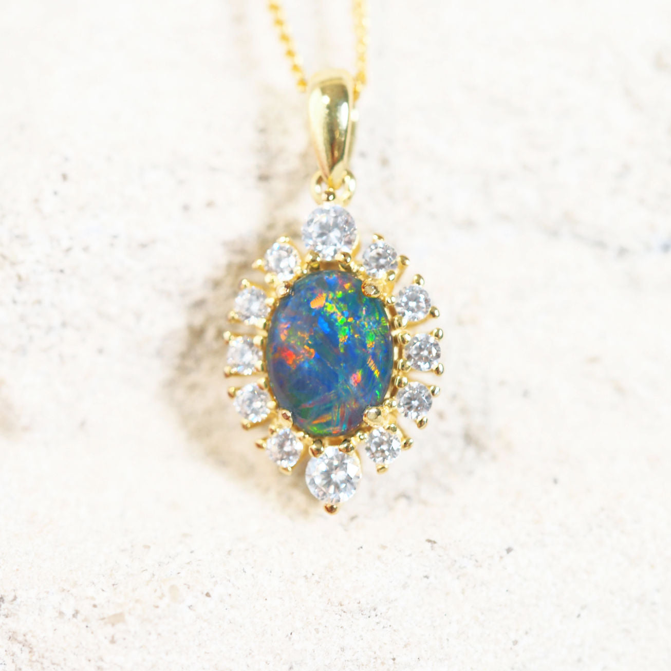 Galoraは、魅惑的なオーバルシェイプのオーストラリア産トリプレットオパールを爪留めにした、美しいゴールドメッキシルバーペンダントです。鮮やかなマルチカラーのオパールは、12個のきらめくキュービックジルコニアに囲まれ、さらに輝きを増しています。このペンダントには、ゴールドメッキチェーンが無料で付属し、あなたのスタイルを完成させます。