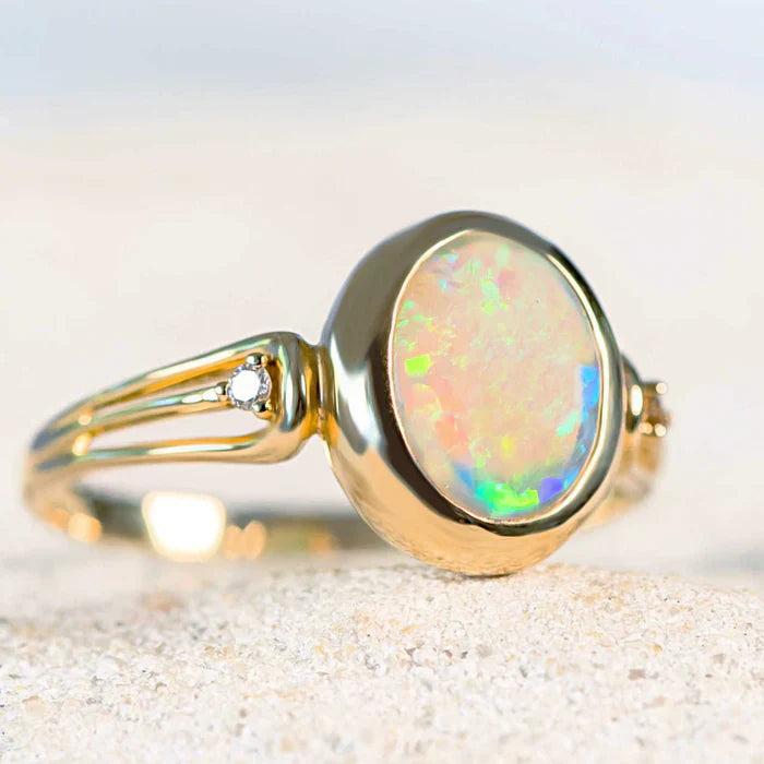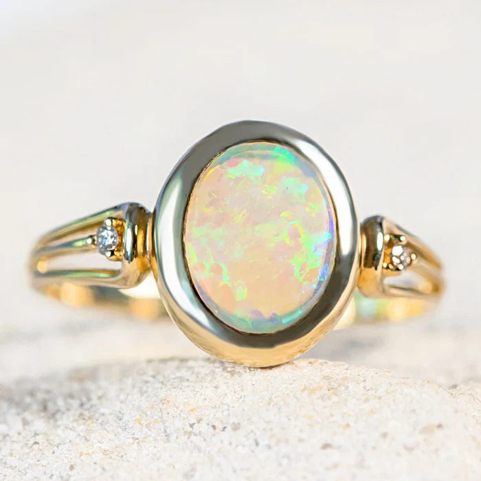 息を呑むほど美しい14カラットイエローゴールドのリング「Aurelia」で、純粋なエレガンスにご挨拶を。きらめきと洗練さを極めたリングです。鮮やかなオーバルシェイプの南オーストラリア産ソリッドクリスタルオパールが、多彩な輝きを放ちます。きらめくホワイトダイヤモンド2石が、さらなる華やかさを添えます。特別なイベントにも、普段使いにも、このリングは存在感を放ちます。