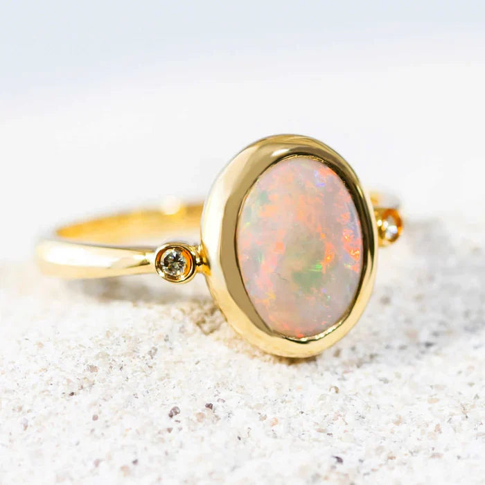 このリングは、倫理的に調達された天然のオーストラリア産オパールを特徴としており、あらゆる機会にふさわしい、美しく責任ある選択です。安心してお求めいただけるよう、署名入りの鑑定書が付属します。
