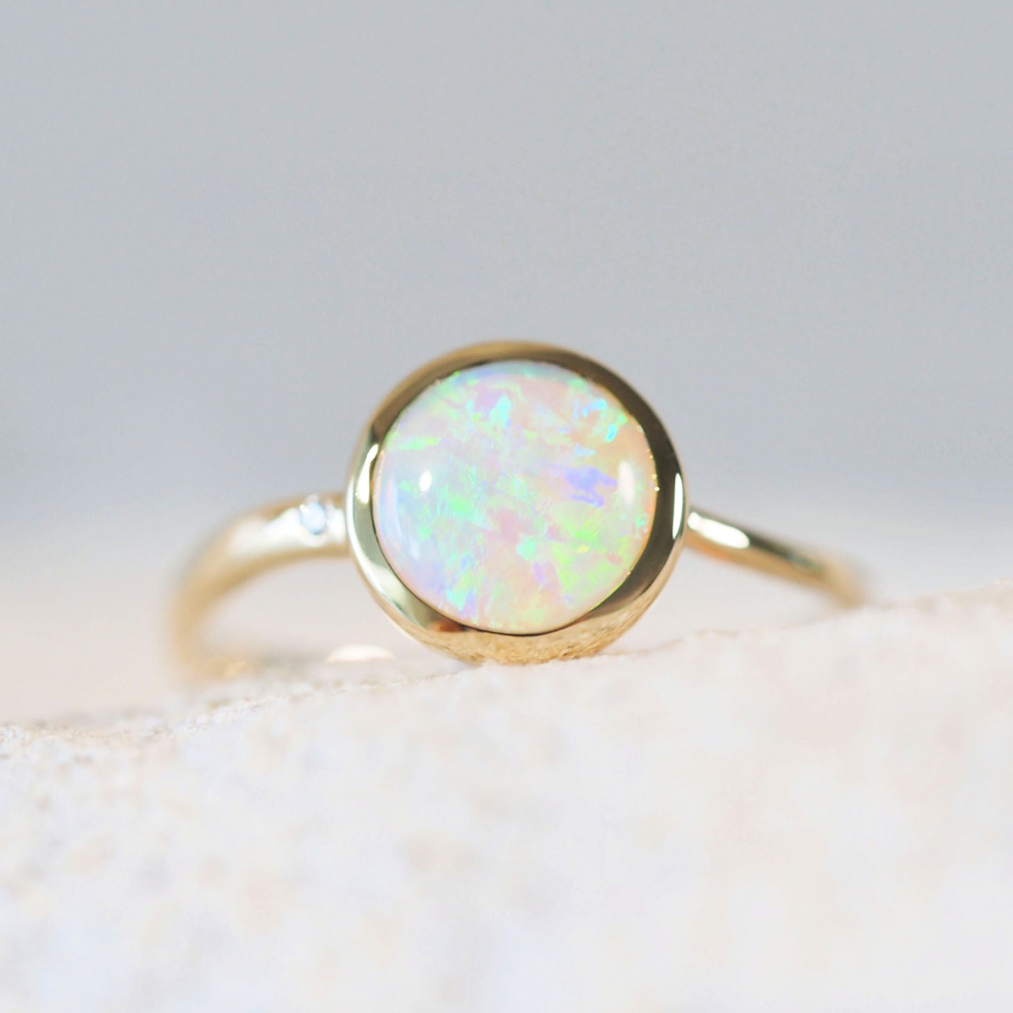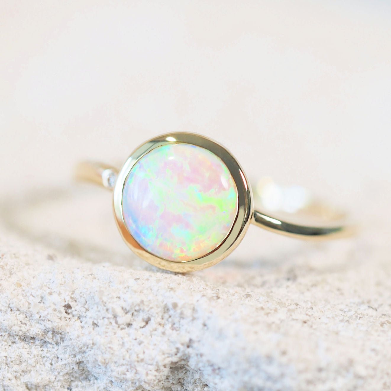 Vadaは、豊かな色彩と品質で知られるクーバーペディ産の、倫理的に調達された天然のオーストラリア産オパールを使用しています。洗練されたクラシックなデザインと一粒のダイヤモンドがアクセントとなったこのリングは、あなたのジュエリーコレクションにふさわしい逸品です。