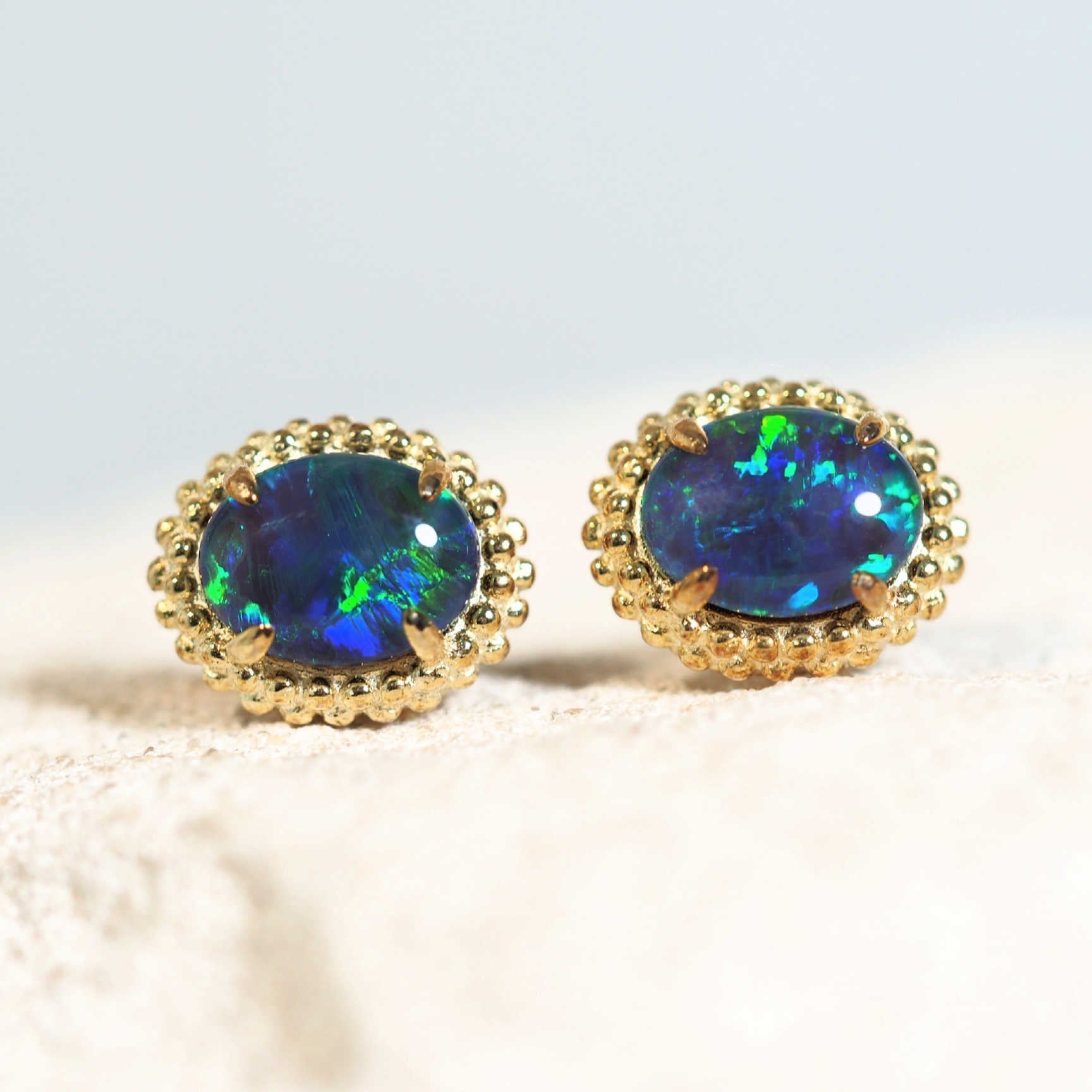 Each pair of Breezy Blue earrings showcases ethically sourced Australian opals, crafted with care and designed to bring a fresh, stylish vibe to your look. Please note: due to the natural variations in opal patterns, each pair is unique and may slightly differ.