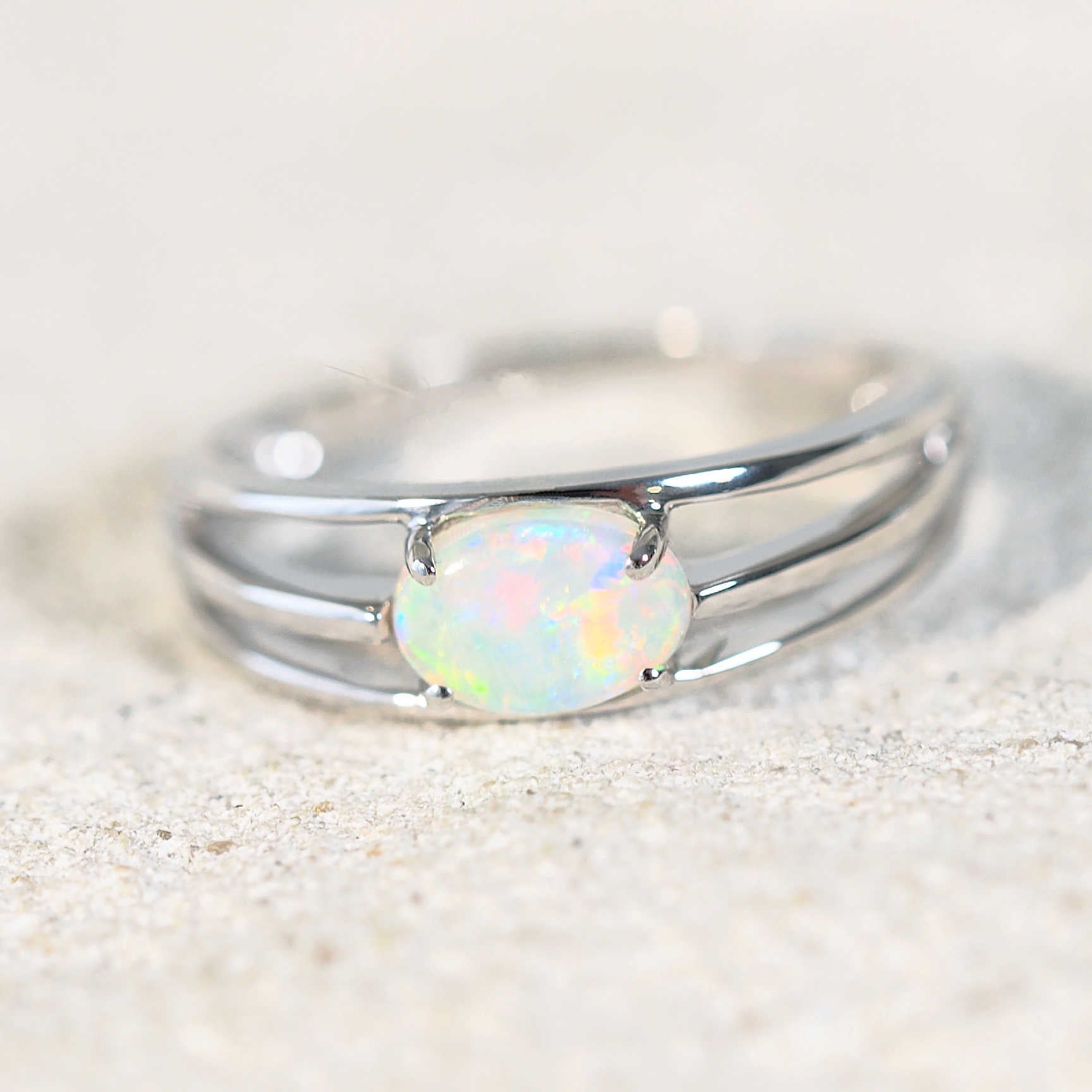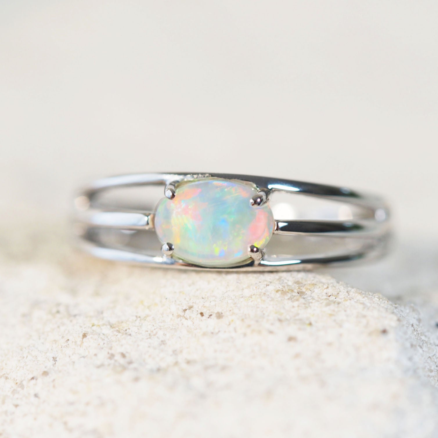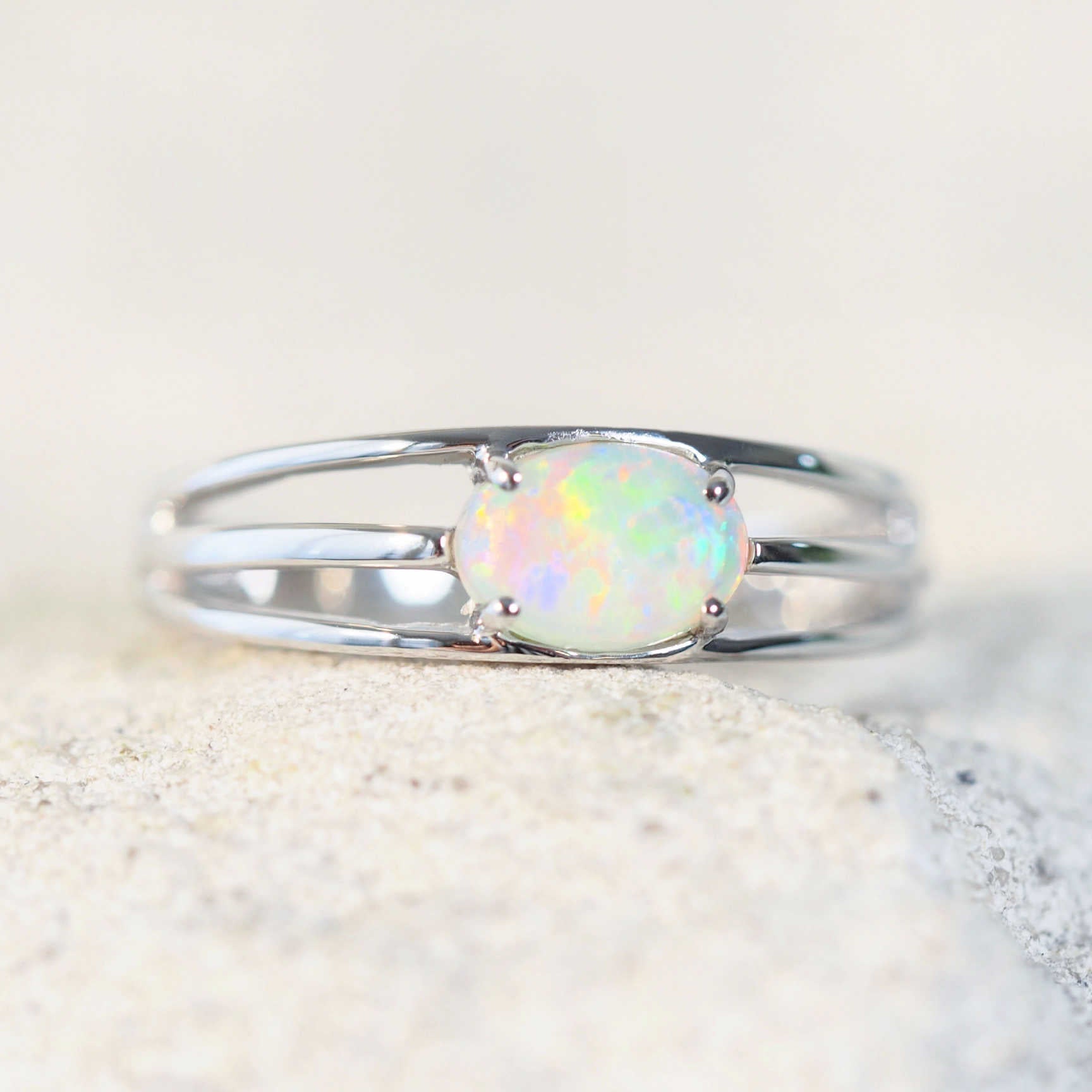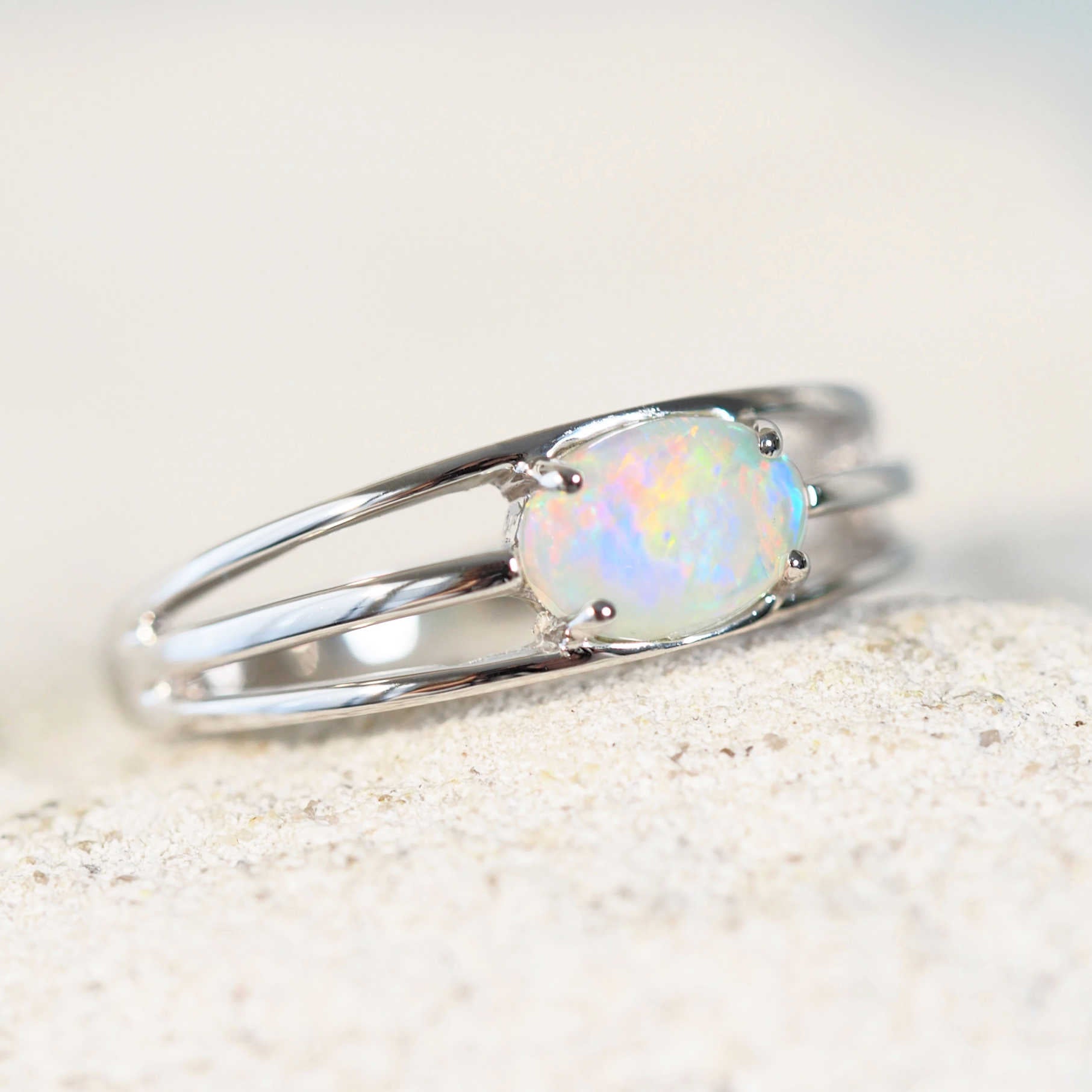 The Lyanna is a sleek and modern 14ct white gold opal ring designed with a stunning triple-banded style. Its claw-set, oval-shaped South Australian solid crystal opal radiates vibrant multi-colored flashes, making it the perfect choice for someone who loves a unique, eye-catching piece.