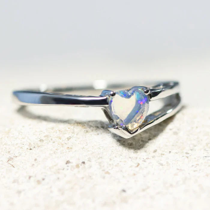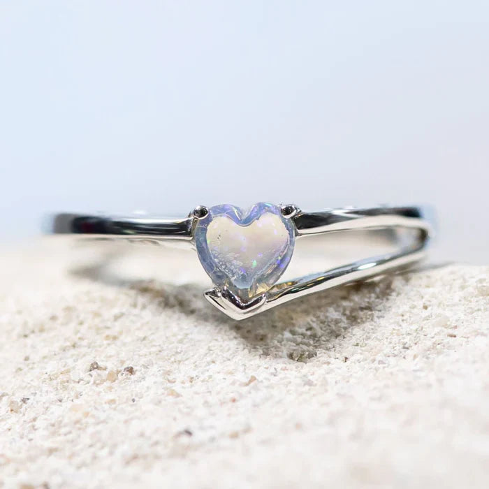 Vada brings a touch of romance and sparkle with this stunning sterling silver ring. Featuring a heart-shaped South Australian solid crystal opal, this ring flashes vibrant hues of blue, green, and purple, making it truly one-of-a-kind. Whether you're gifting it to someone special or treating yourself, it's the perfect piece for any occasion.