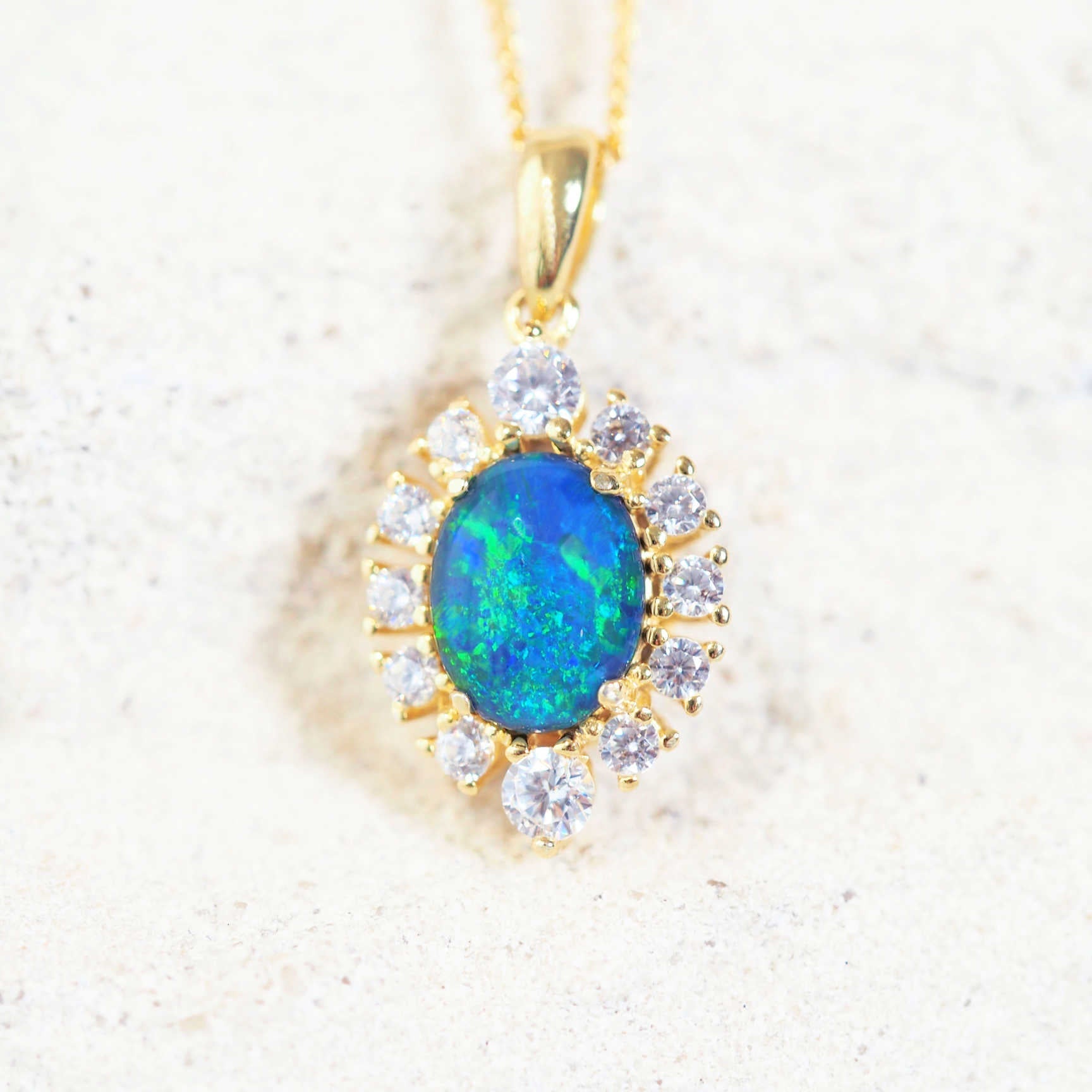セラフィナ – ゴールドメッキシルバーブルー&グリーントリプレットオパールペンダント