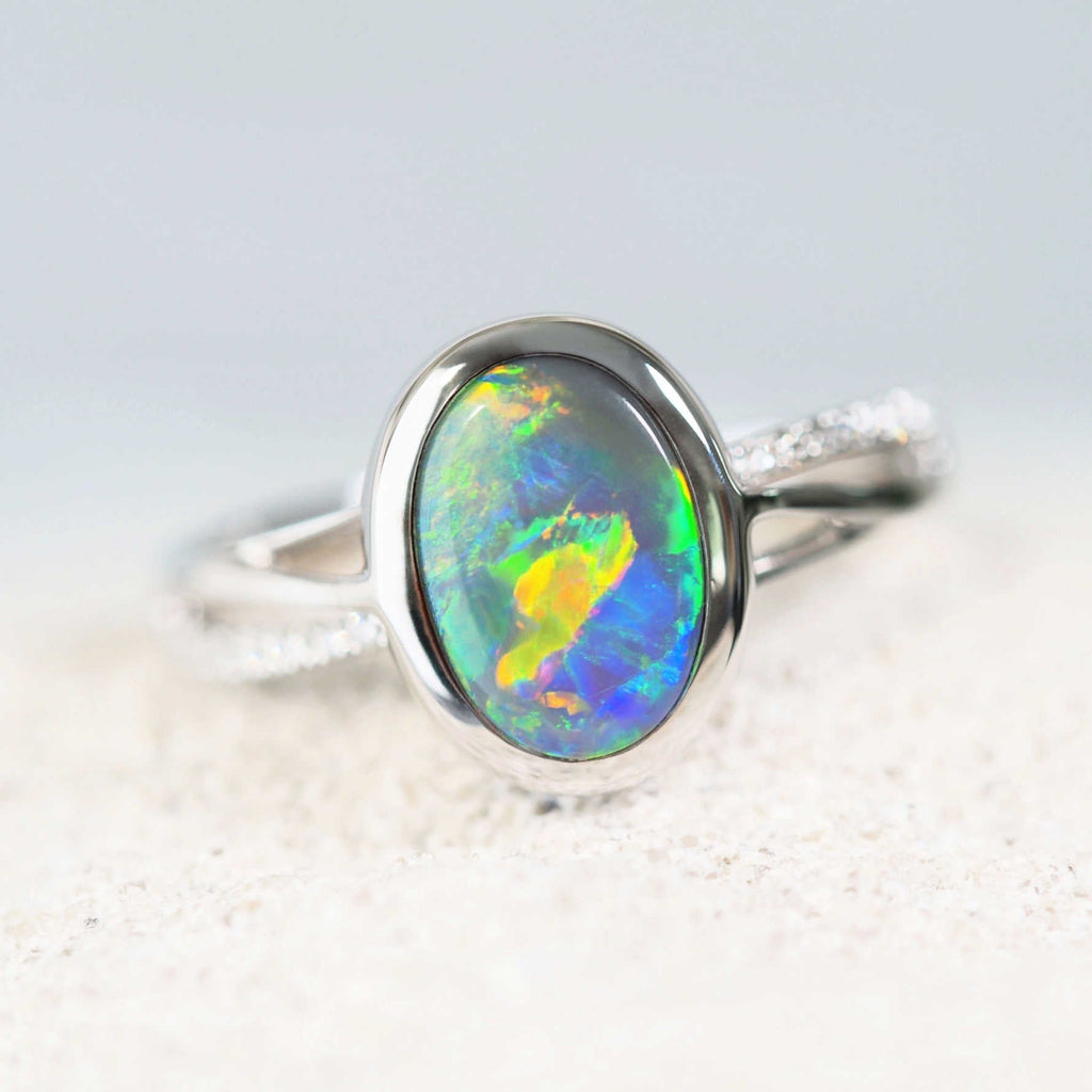 Vada – 18カラットホワイトゴールド マルチカラー ブラックオパール リング(ダイヤモンド付き)