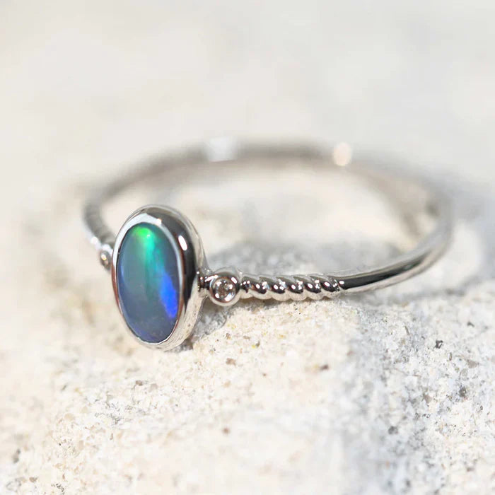 アリエル – 14カラットホワイトゴールドブラックオパールリング