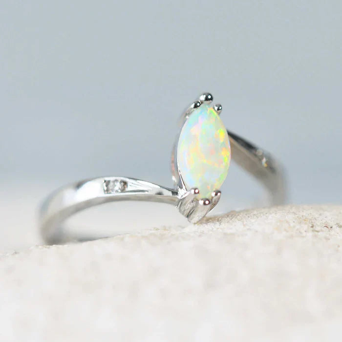 洗練された雰囲気とモダンなデザインが見事に融合した「アリエル」 。14カラットのホワイトゴールドに、南オーストラリア産の美しいマーキスシェイプのクリスタルオパールをあしらったリング。多彩な色合いが美しく輝き、美しく輝きます。爪留めされた2石のホワイトダイヤモンドが、より一層の輝きを添えます。夜のお出かけにドレスアップする時も、コレクションに個性的な一品を加えたい時も、このリングはきっと目を惹くでしょう。
