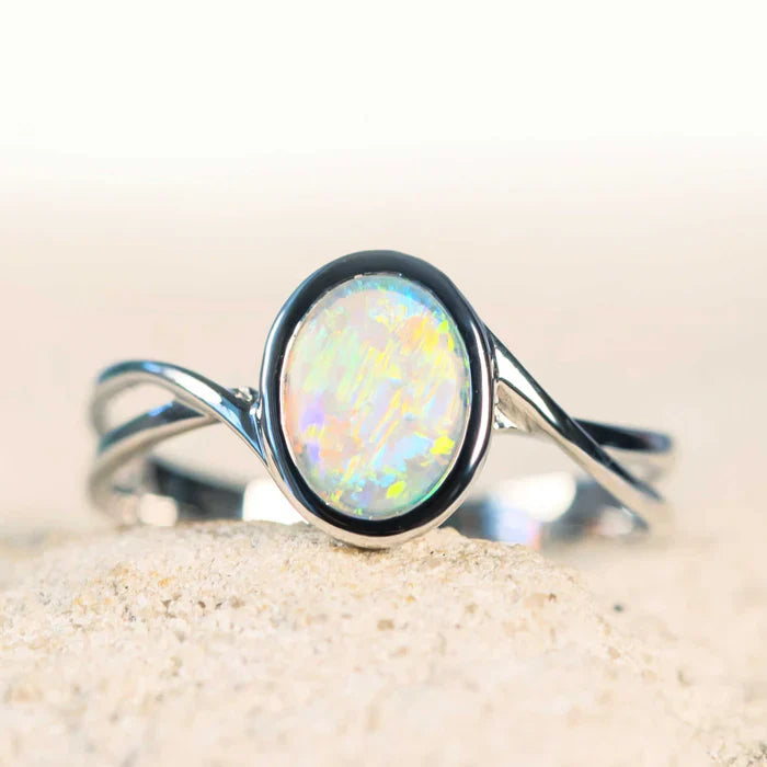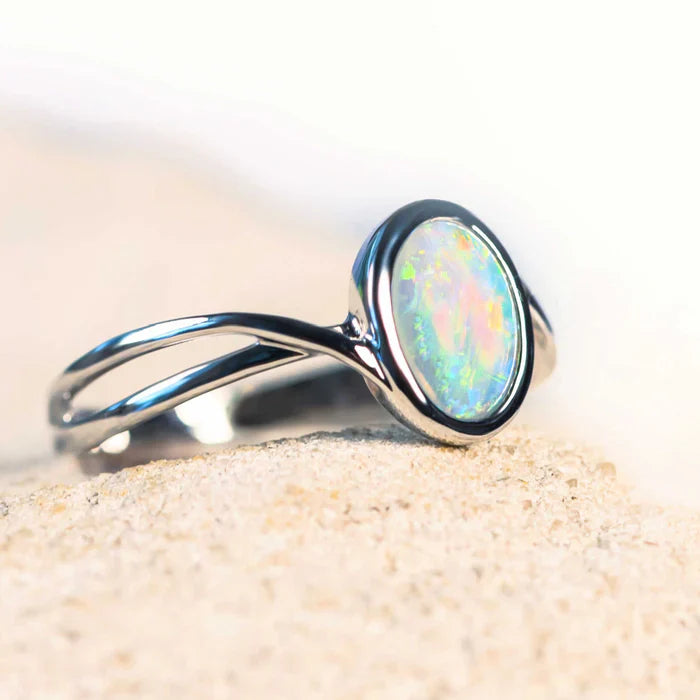 アリエルは、時代を超越したエレガンスとモダンな魅力が完璧に融合したリングです。この美しいリングは、18金ホワイトゴールドのツイストバンドに、鮮やかなマルチカラーのオーバル型オーストラリア産ソリッドクリスタルオパールが美しくベゼルセッティングされています。クーバーペディで倫理的に調達されたこのオパールは、魅惑的な色合いを放ち、特別な日にも、洗練された日常にも映える、際立つ一品です。