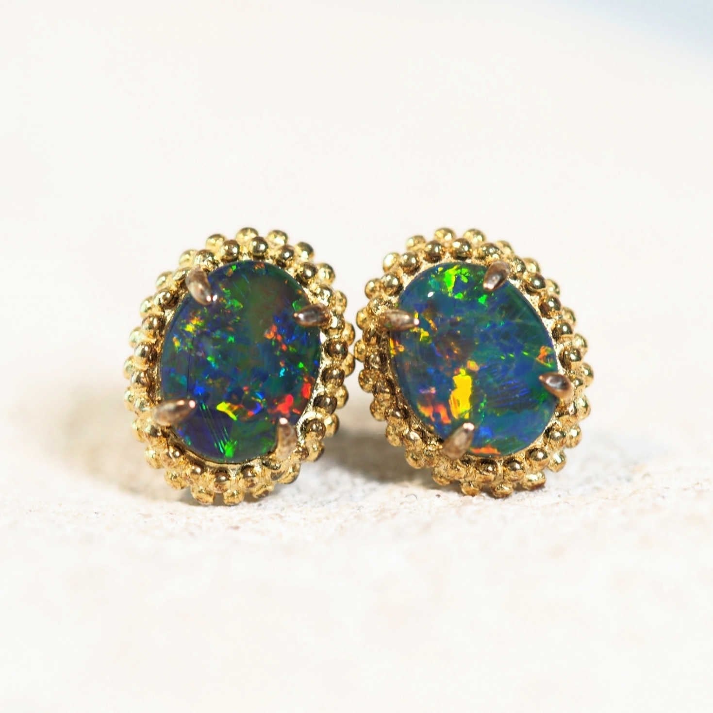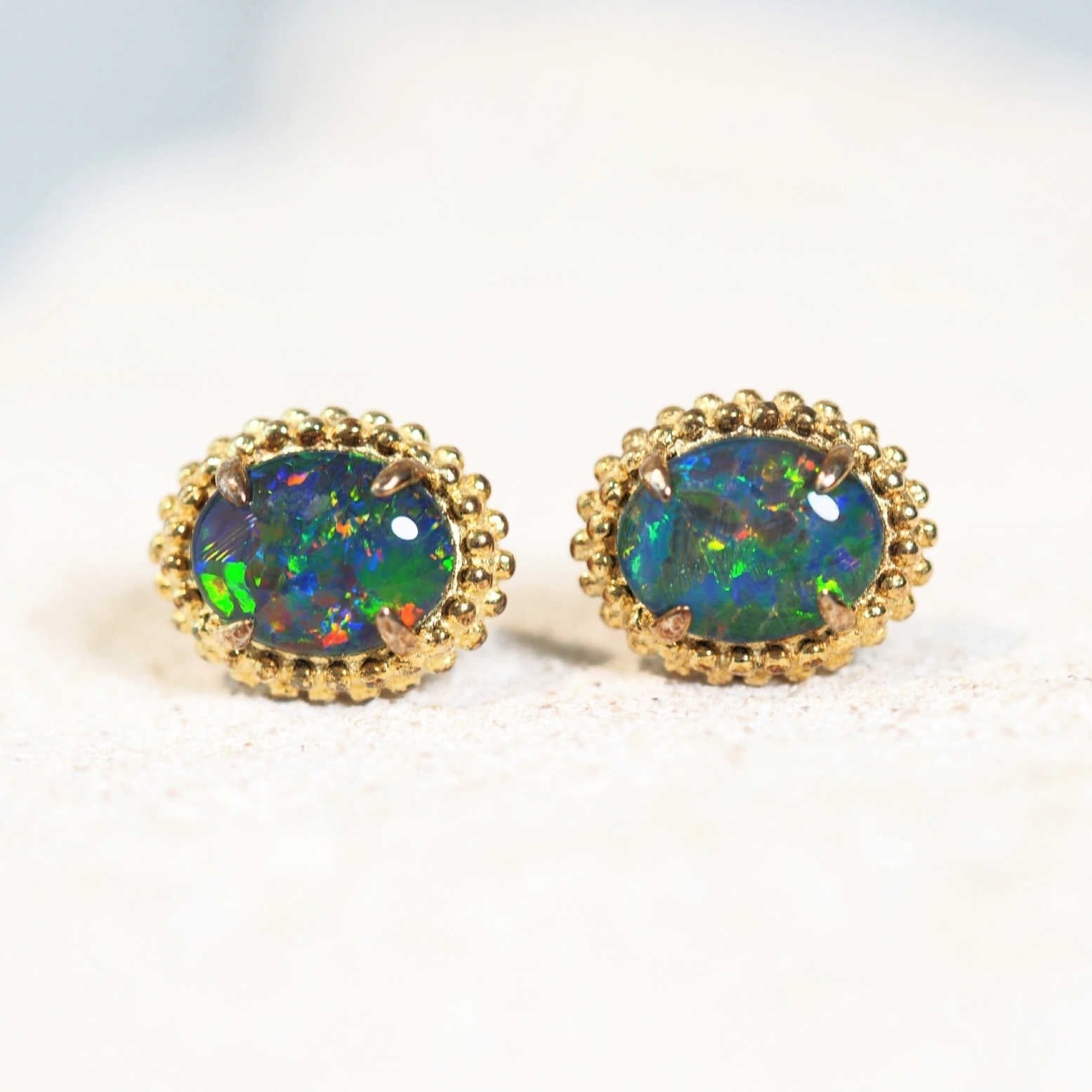 Breezyスタッドピアスは、美しいゴールドメッキシルバーに、鮮やかなブルーとグリーンのオーストラリア産トリプレットオパールが美しくセットされています。オーバルシェイプのオパールは光を捉え、鮮やかな彩りを添え、どんなシーンにもぴったりです。