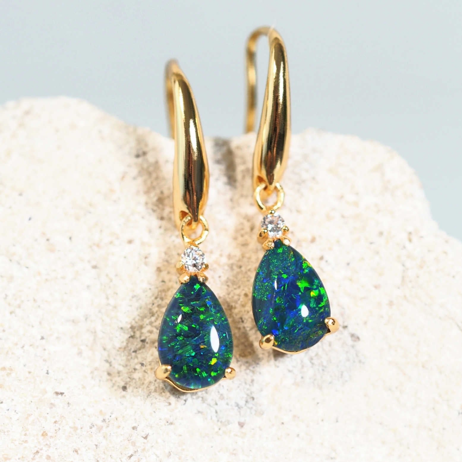 エレガンスと魅力が完璧に融合した、ブリエラの美しいイヤリング。鮮やかなブルーとグリーンの色合いを持つオーストラリア産トリプレットオパールが、洗練されたゴールドメッキのシルバーフレームにセットされています。ティアドロップシェイプにきらめくキュービックジルコニアのアクセントが、あなたの装いにさらなる輝きを添えます。