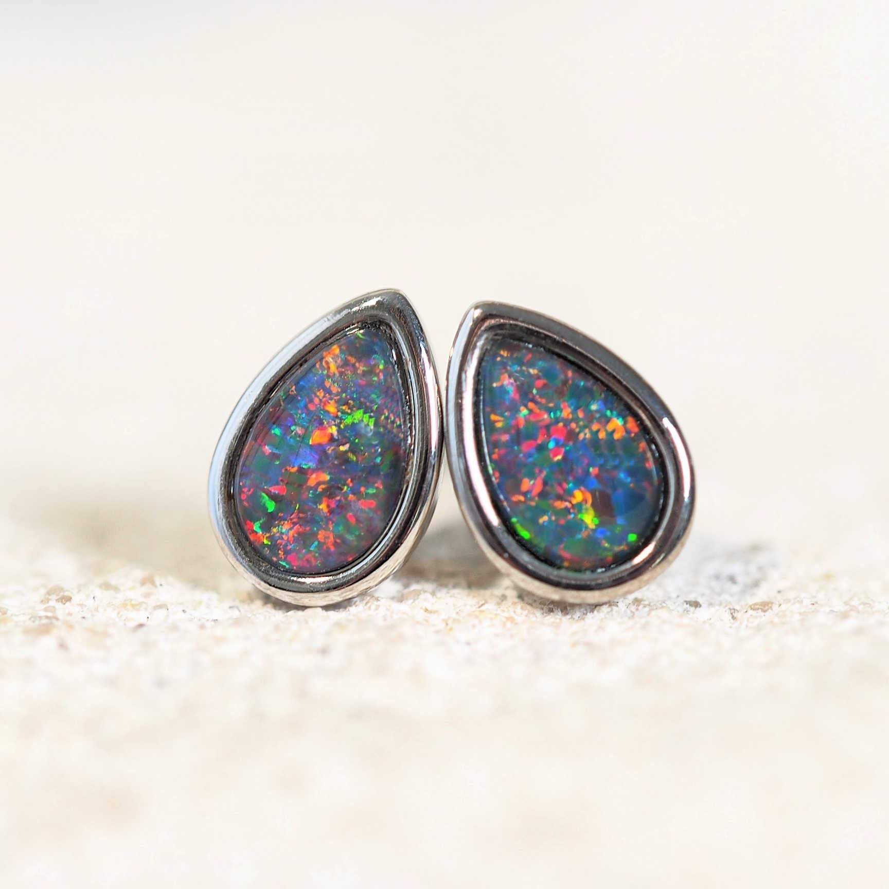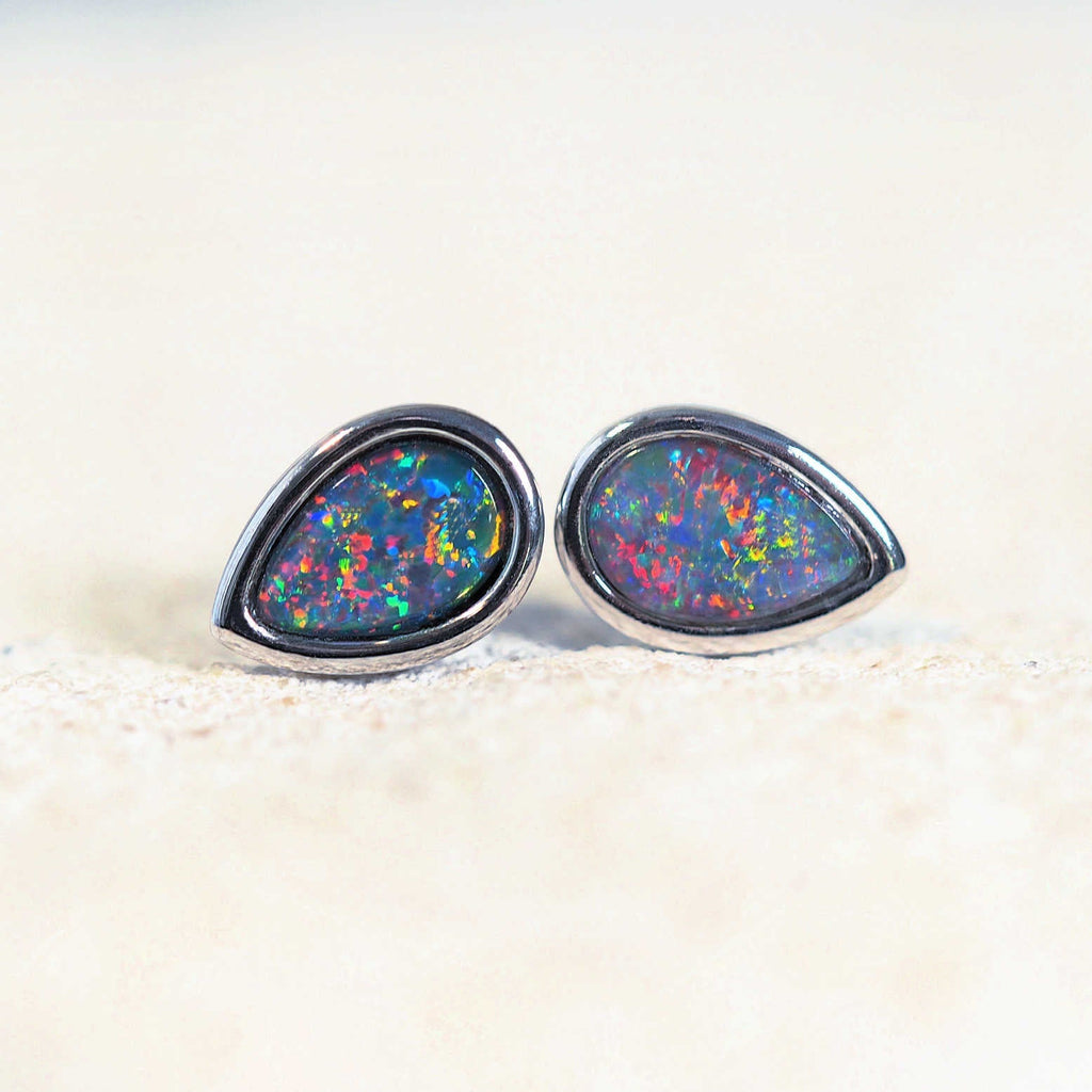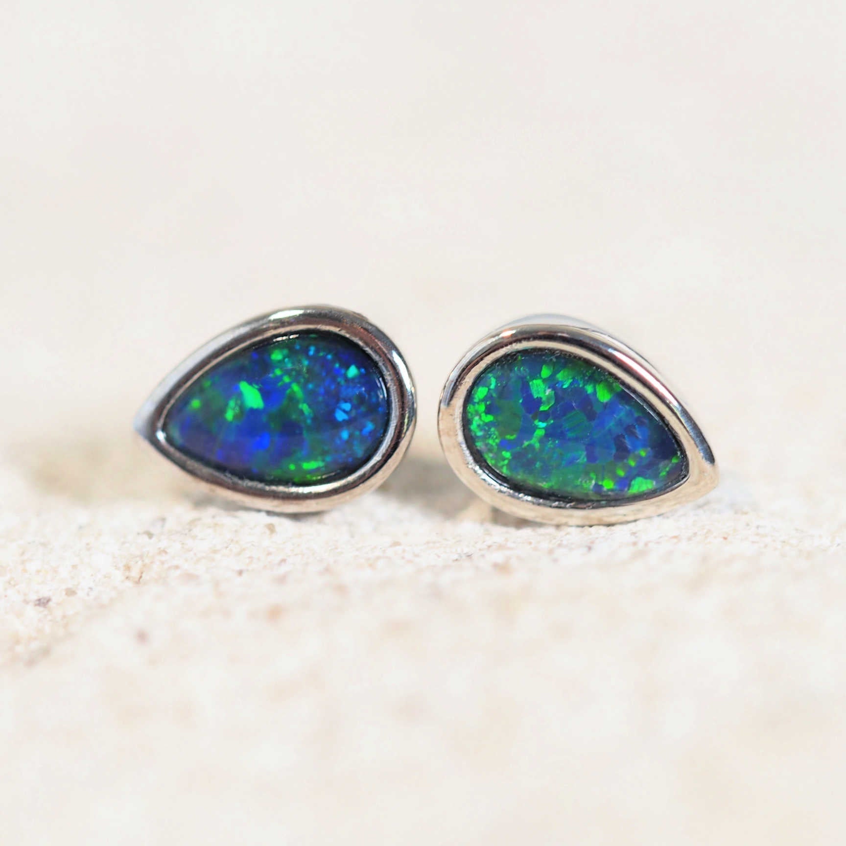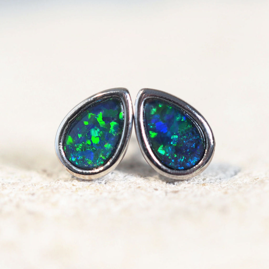 セリーヌの美しいスターリングシルバーのスタッドピアスをご紹介します。目を引くティアドロップ型のオーストラリア産トリプレットオパールがセットされています。オパールは、多彩な色合いから美しいブルーとグリーンの色合いまで、鮮やかな色合いを織りなしています。それぞれのピースが、あなたの装いに自然な美しさを添えるようデザインされています。