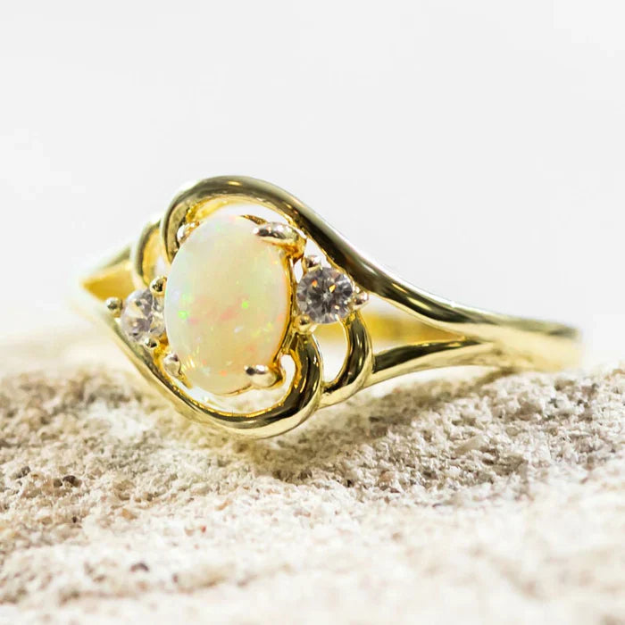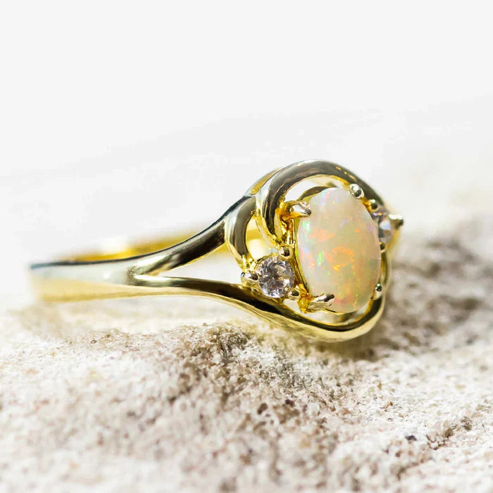 夢のようなゴールドメッキシルバーリング、Elaraをご紹介します。誰もが注目するデザインです。エレガントな渦巻き模様に、南オーストラリア産の鮮やかなオーバルシェイプのソリッドホワイトオパールがあしらわれています。爪留めで完璧にセッティングされ、2つのきらめくキュービックジルコニアがアクセントとなり、輝きを放ちます。カジュアルなお出かけにも特別な日にも、Elaraはどんな装いにも自然なエレガンスを添えます。