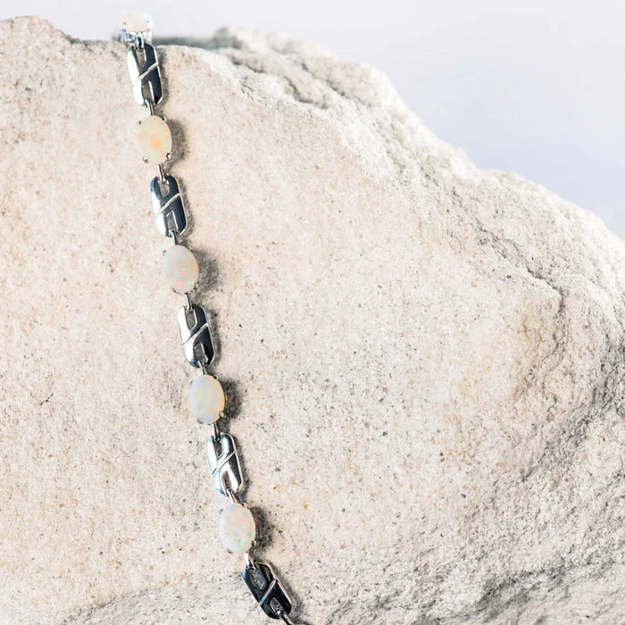 エレガントさと汎用性をジュエリーコレクションにプラスするブレスレット、 Elaraをご紹介します。スターリングシルバーの美しいブレスレットは、スタイリッシュなダブルリンクデザインに、まばゆいばかりの南オーストラリア産ソリッドホワイトオパール5個をあしらっています。それぞれのオパールはピンク、ブルー、グリーンの多彩なハイライトを放ち、あなたの装いを明るく彩ります。フィット感の調節も可能なElaraは、どんなシーンにもぴったりのスタイルを演出します。