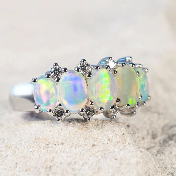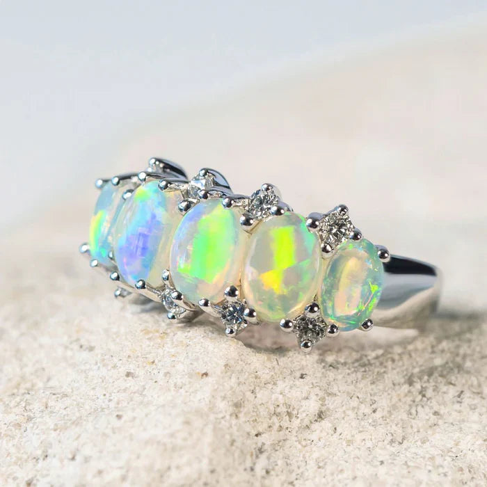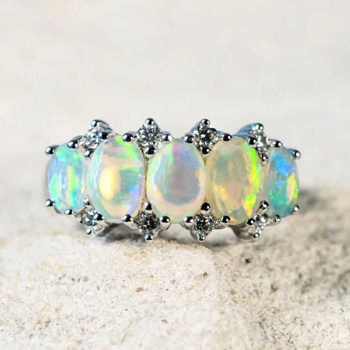 Elowenは、究極のエレガンスと魅力を体現するリングです。この14カラットのホワイトゴールドリングには、鮮やかなグリーンとブルーの色合いが美しいオーバルシェイプの南オーストラリア産ソリッドクリスタルオパールが5個、完璧に爪留めされています。オパールを引き立てる8個のまばゆいばかりのホワイトダイヤモンドが、洗練された輝きを添えています。