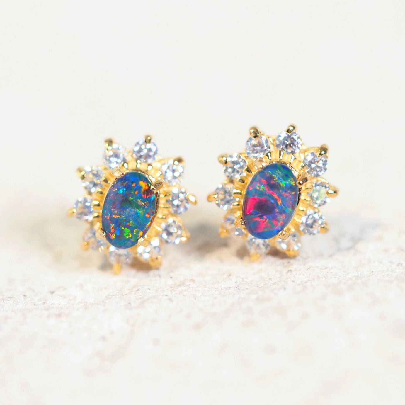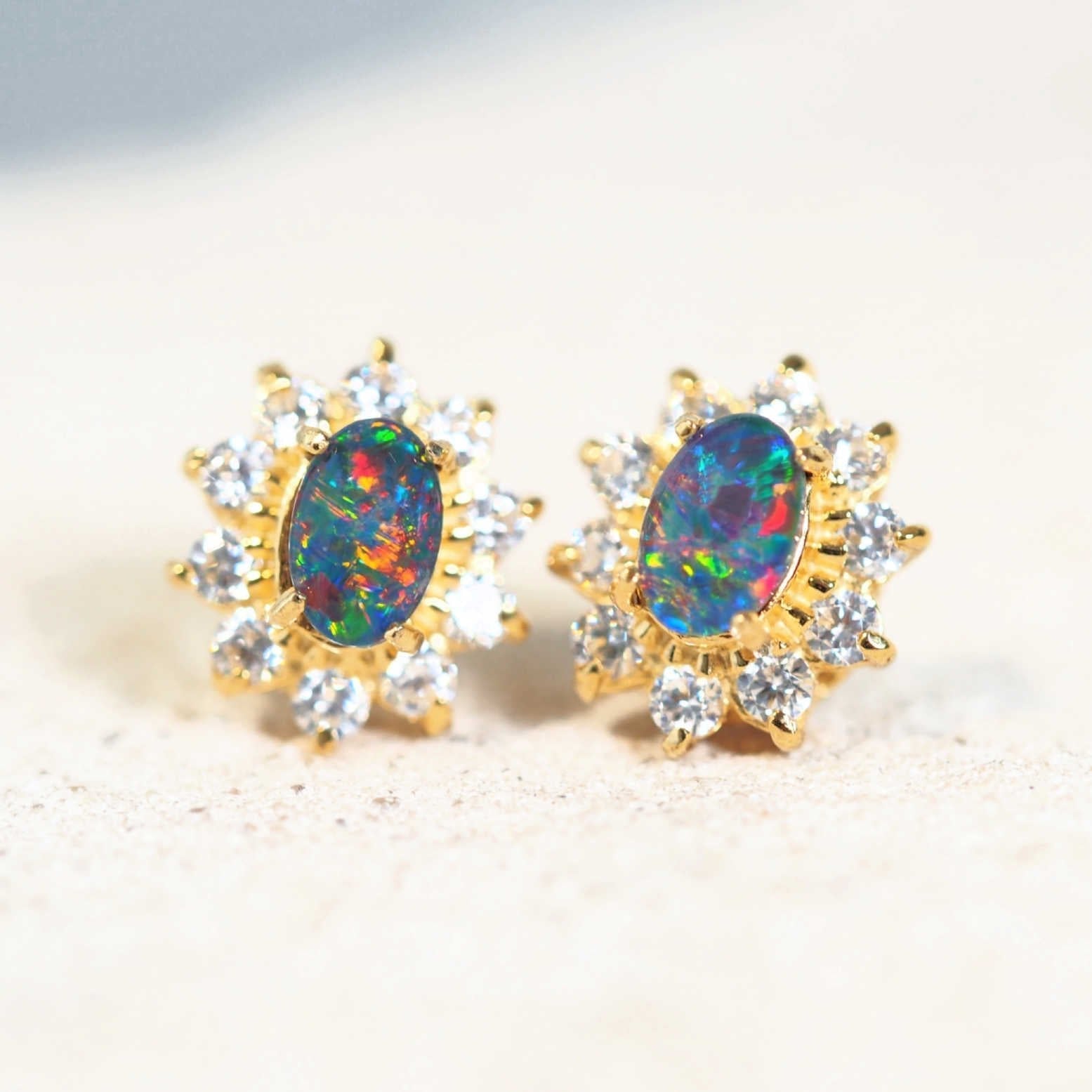 時代を超えたエレガンスを、Islaのゴールドメッキシルバートリプレットオパールイヤリングであなたの装いにプラスしませんか?このシックなスタッドイヤリングは、オーバルシェイプのオーストラリア産トリプレットオパールをゴールドメッキシルバーに爪留めし、魅惑的な鮮やかな色彩を放ちます。それぞれのオパールは10個のきらめくディアマンテで美しく縁取られ、洗練さと魅力が完璧に融合したイヤリングとなっています。
