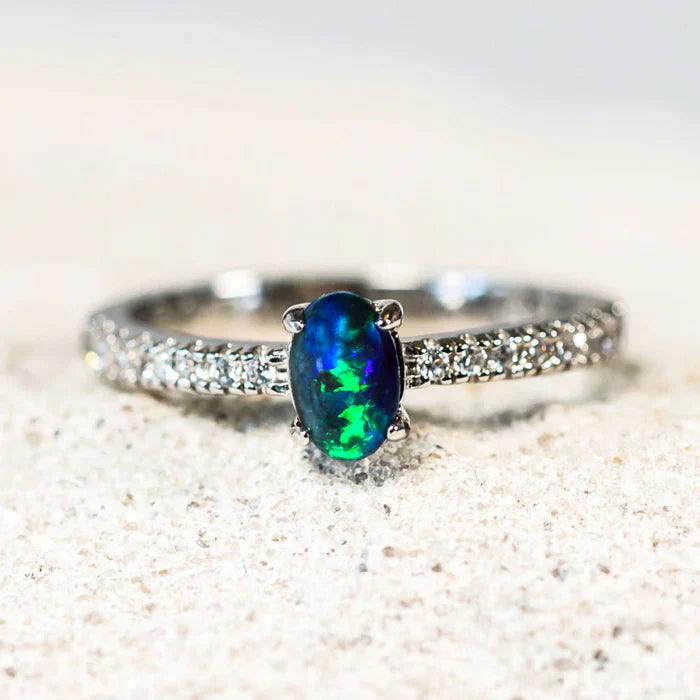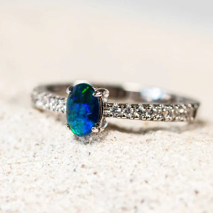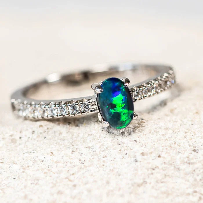 セレーネ – スターリングシルバー オーバル ブルーグリーン トリプレットオパールリング