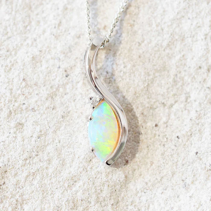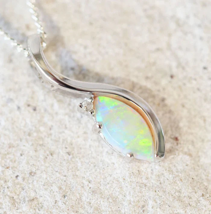 セラフィナをご紹介します。マーキスシェイプの美しいクリスタルオパールをあしらった、シックな14カラットホワイトゴールドのネックレスペンダントです。南オーストラリア産の鮮やかなグリーンオパールは、洗練された現代的な爪留めデザインにセットされ、きらめくホワイトダイヤモンドが完璧な輝きを添えています。シルバーメッキのチェーンが付属しているので、すぐに身につけて、華やかに演出できます。
