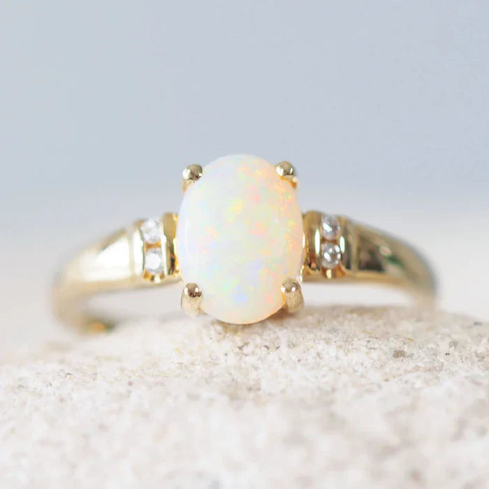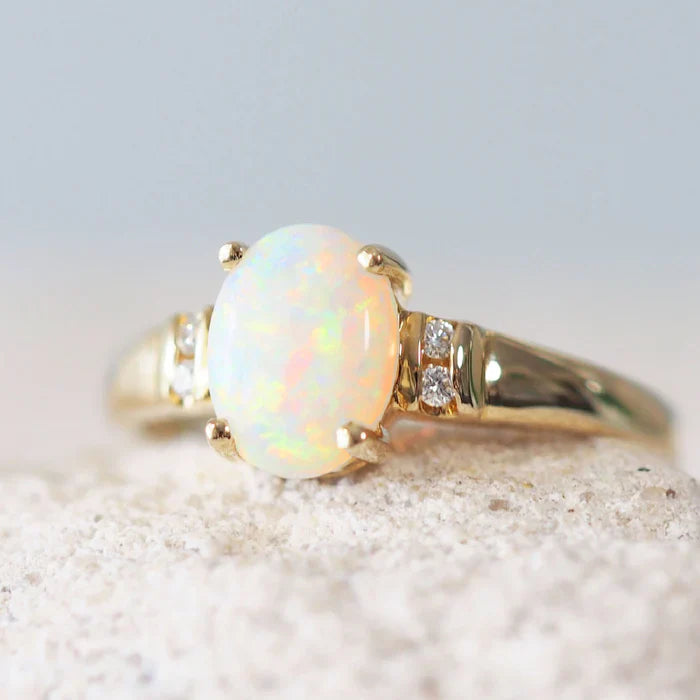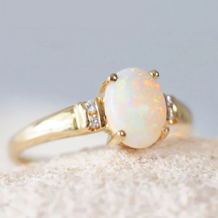 シエナは、南オーストラリア産の美しく多色なオーバルシェイプのソリッドホワイトオパールをあしらった、14カラットのイエローゴールドリングです。オパールは爪留めされ、ショルダー部分には4石の輝くホワイトダイヤモンドがあしらわれ、より一層のエレガントさを添えています。目を引くこのリングは、特別な瞬間を祝うときも、自分へのご褒美として素敵な贈り物をするときも、あらゆるシーンにぴったりです。