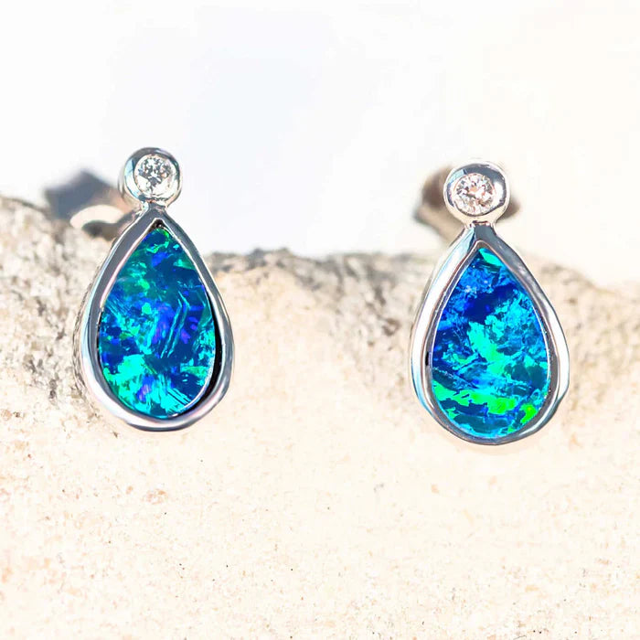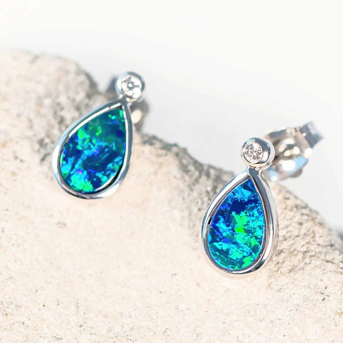 Vadaの14カラットホワイトゴールド、ダブレットオパール&ダイヤモンドスタッドピアスで、どんな装いにもエレガントな雰囲気を添えましょう。美しいティアドロップ型のオーストラリア産ダブレットオパールは、鮮やかなブルーとグリーンの色合いで、贅沢な14カラットホワイトゴールドにセットされています。きらめくホワイトダイヤモンドが、より一層の輝きを放ちます。フォーマルな装いにも、カジュアルな装いにも、このピアスはオパールの魔法をあなたの毎日に彩ります。