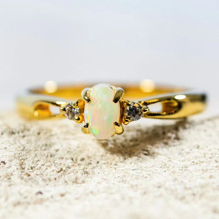 Vada ― エレガンスとスタイルを兼ね備えた、美しいゴールドメッキシルバーリング。センターピースには、南オーストラリア産の美しいマルチカラーのオーバルシェイプのクリスタルオパールをあしらい、洗練された爪留めデザインにセットしました。ショルダーセットの2つのキュービックジルコニアが、あなたの内面の輝きを引き出し、どんな装いにも完璧なラグジュアリー感を添えます。