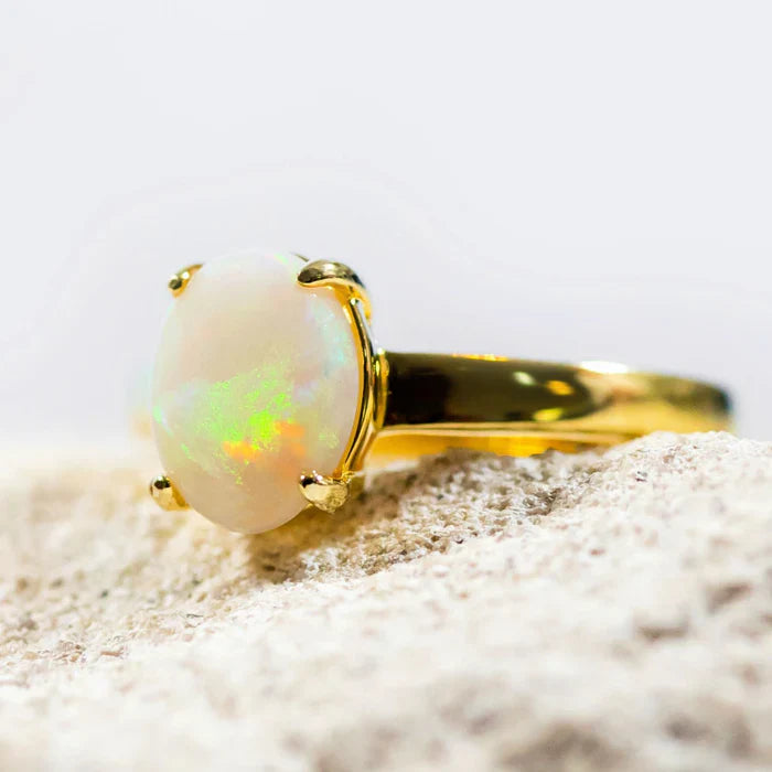 エレガンスと鮮やかなスタイルが究極に融合した、Vadaへようこそ。この美しいゴールドメッキシルバーオパールリングは、南オーストラリア産のオーバルシェイプのソリッドホワイトオパールを爪留めし、多彩な色合いを放ちます。時代を超越したデザインは、どんなシーンにも映える完璧なステートメントピースとして、あなたのコレクションに洗練された雰囲気を添えます。