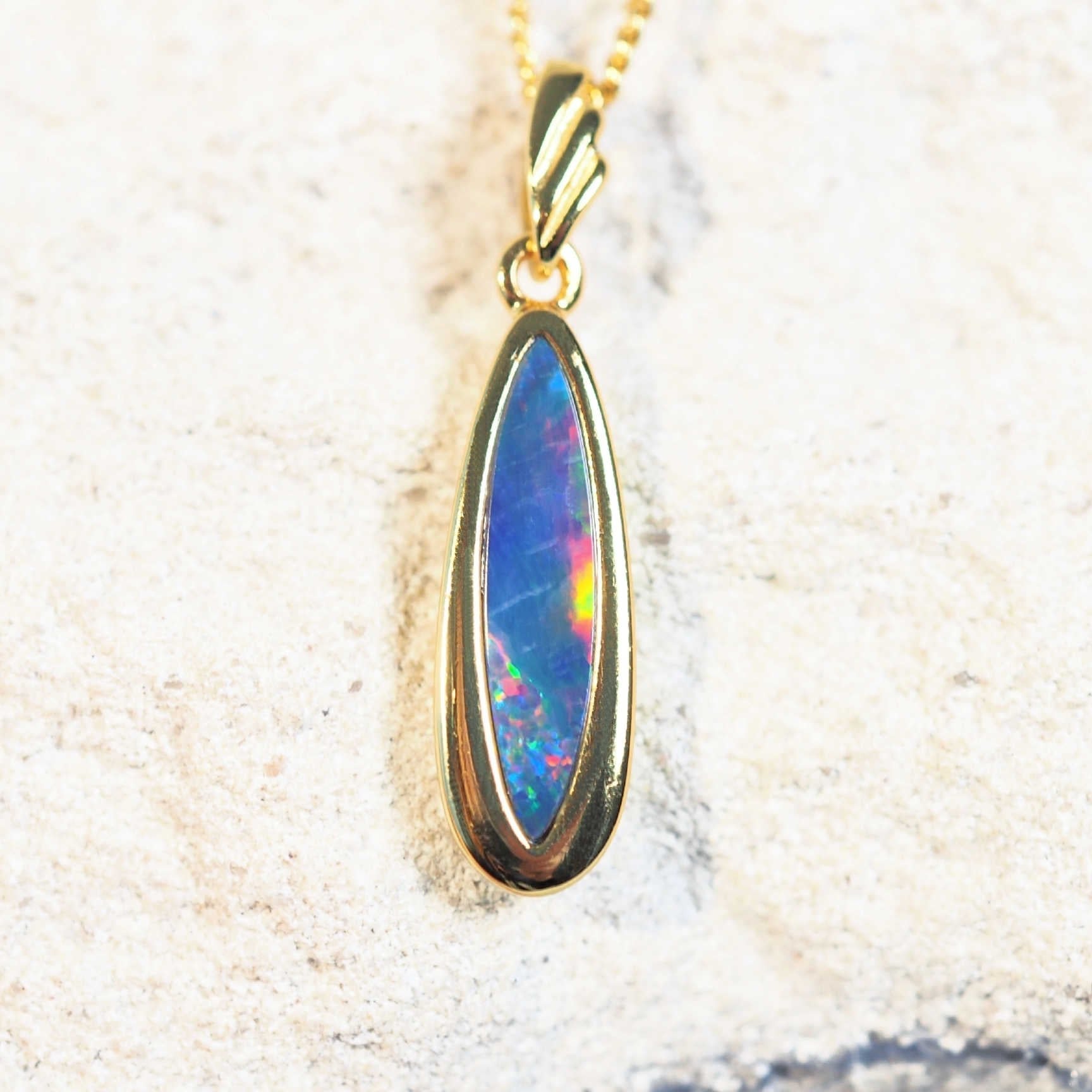 ヴェガペンダントは、鮮やかなマルチカラーのオーストラリア産ダブレットオパールをマーキスカットにあしらった、他に類を見ない美しい逸品です。ゴールドメッキのシルバーベゼルにセットされた、洗練されたデザインです。ゴールドメッキのチェーンが付属し、どんな装いも格上げする、まさにステートメントピースです。