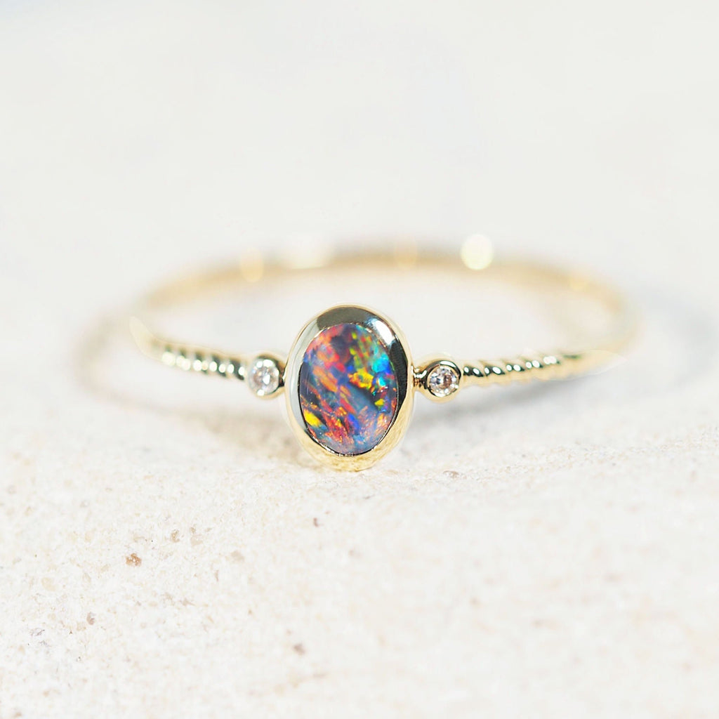 ライトニングリッジ産のマルチカラーのブラックオパールをあしらった、美しい14カラットイエローゴールドリング「Viora」をご紹介します。独特の模様と鮮やかな色彩を放つこのオパールは、洗練された繊細なベゼルデザインにセットされています。2石のきらめくホワイトダイヤモンドをあしらった「Viora」は、どんなシーンにも映える、完璧なステートメントピースです。